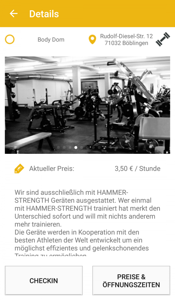 Schau Dir in der Detailansicht an, was das Studio zu bieten hat. Mehrere Bilder ermöglichen Dir hier auch einen digitalen Rundgang. Einige Gyms wurden außerdem bereits von Nutzern bewertet. Die Stundenpreise für unsere Studios orientieren sich stets an deren Mitgliedschaften und entsprechen etwa einem Zehntel dieser. Beispielsweise bezahlst Du für ein Studio, welches im Monat für eine Mitgliedschaft (inklusive Getränke etc.) 50 € berechnet, bei GYMMER ca. 5€ / Stunde. Einige Studios bieten jedoch auch Sonderpreise zu bestimmten Zeiten an, es kommt also vor, dass Du sogar günstiger trainieren kannst. Eine Übersicht über die Preise findest Du unter „Preise & Öffnungszeiten“ in der Detailansicht.